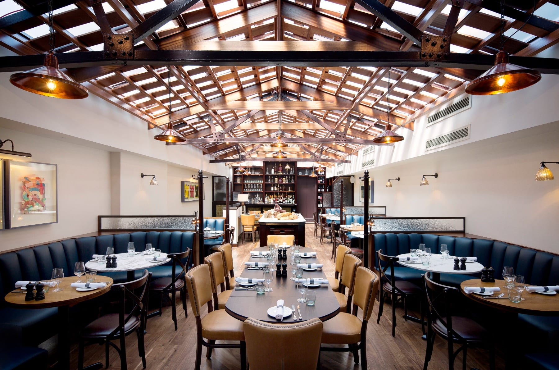 Leather banquettes and a long marble dining bar for Angela Hartnett’s Italian dishes.